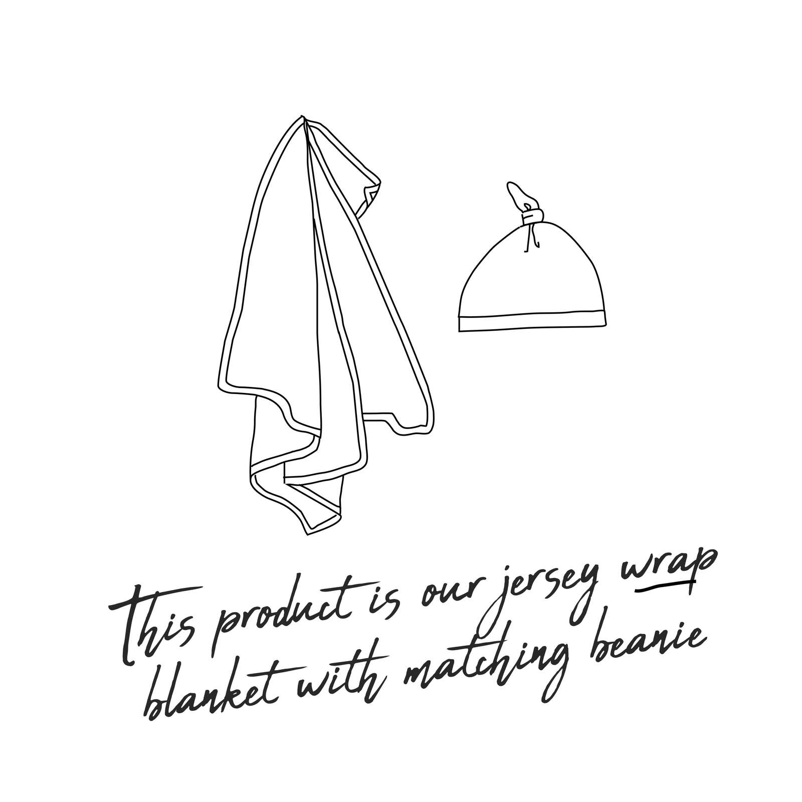 100% Cotton knit jersey wrap. It measures approx 100cm x 100cm. This wrap comes with a matching beanie.